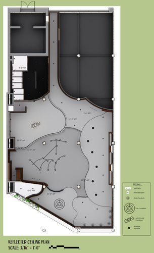The ceiling was designed to mimic the flow of the rivers of Brazil and the Amazon. Each area of the restaurant has a different height and follow the curves of the spaces below it. The entrance with the Host Station sits at 11'-6" AFF, with the Waiting Station siting 3" below it. The Bar sits another 3" below the Waiting Area, at 11'-0" AFF. The Main Dining area has a finished ceiling that sits just below the ceiling beams, at 11'-9" AFF. The Private Dining area has a finished ceiling at 11'-0" AFF and the back hallway has a finished ceiling at 11'-3" AFF. Between each ceiling height change is a soffit and cove lighting that illuminates each ceiling, creating the illusion of stepping from one space to the next. The public areas have a dark gray ceiling that helps the space to appear endless. The lowest ceilings are found in the Coat Closet and Restroom, sitting at 10'-0" AFF. The ceiling in the Coat Closet and inside the stalls of the Restroom are painted white as this is a tighter space, and the communal area of the Restroom is painted black.